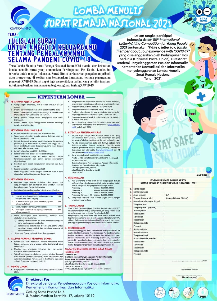 Kompetisi itu digelar Perhimpunan Pos Sedunia/Universal Postal Union (UPU) dalam ajang 50th International Letter-Writting Competition for Young People 2021. Tahun ini tema yang diangkat Write a letter to a family member about your experience with COVID-19.