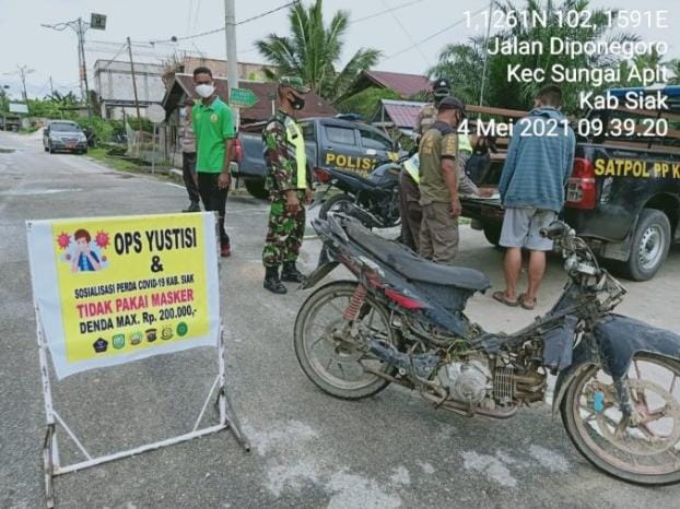 Siak –Koramil 06/ Sungai Apit bersama aparat gabungan menggelar kegiatan Pendisiplinan Prokes di Jalan Diponegoro kecamatan Sungai Apit Kabupaten Siak, Selasa (04/05/2021).