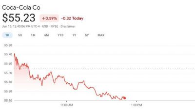 Dilansir Marca, saham Coca-Cola Company (KO) anjlok dari yang tadinya bernilai 56.10 dolar Amerika Serikat per lembarnya, menjadi 55.20 dolar. Nilai perusahaannya turun dari 242 miliar dolar atau Rp 3,44 kuadriliun, menjadi 238 miliar dolar atau Rp 3,38 kuadriliun.