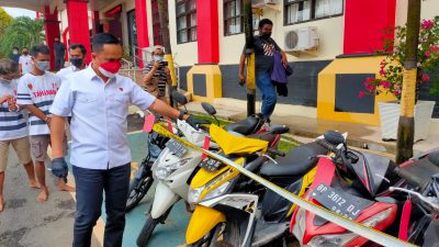 Kemudian untuk barang bukti curanmor yang sudah kita amankan sebanyak 7 unit kendaraan bermotor berbagai merk dan pada inisial ARA dan DG kita amankan juga 1 kunci pas dengan bentuk segitiga, 1 buah besi berbentuk runcing dengan ukuran 6 cm, 1 buah kunci dengan ukuran 17 berwarna silver, 1 unit handphone warna silver”. Ujar Dir Reskrimum Polda Kepri Kombes Pol Jefri Ronal Parulian Siagian, S.IK., M.H