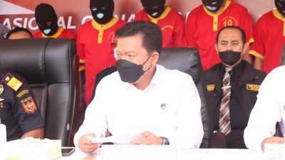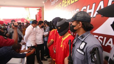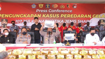 POJOKTIMES.COM – Polresta Barelang menggelar Konferensi Pers Pengungkapan Kasus Peredaran Gelap Narkotika Jenis Shabu seberat 107.258 KG yang di pimpin oleh Wakapolda Kepri Brigjen. Pol. Drs. Darmawan, M.Hum yang di dampingi oleh KA. Kanwil DJBC Akhmad Rofiq, Dir Narkoba KBP Muji Supriyadi, , Kapolresta Barelang KBP Yos Guntur, SH, SIK, MH , KA BNNP Kepri, KA Bea Cukai Batam Ambang Priyonggo, Kajari Bpk. Amanda, Kabidkum Polda Kepri KBP Djoko Trisulo, Ka Pengadilan Negeri Batam, Kabidhumas yang di wakili Kasubdit Multimedia AKBP Surya.