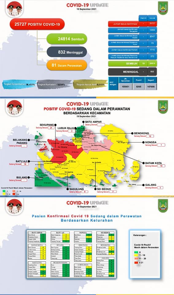Data Covid-19 di Kota Batam sampai 19 September 2021, jumlah kasus positif tercatat sebanyak 25.727 orang, dari jumlah tersebut sebanyak 24.814 dinyatakan sembuh dan 832 orang meninggal dunia. Sementara sisanya sebanyak 81 orang masih menjalani perawatan.(*)