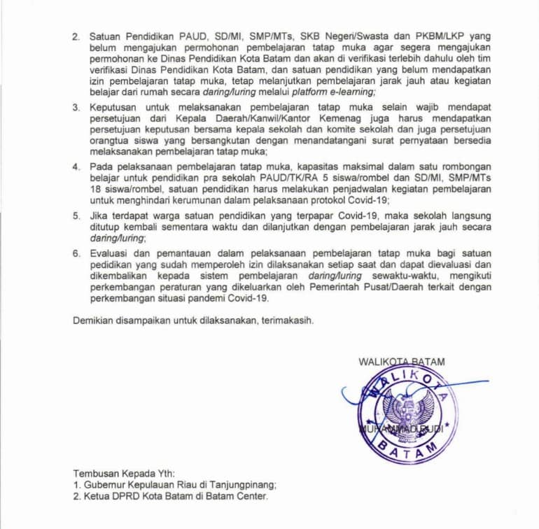 Rudi meminta kepada Kepala Satuan Pendidikan PAUD, SD/MI, SMP/MTs, SKB Negeri/Swasta dan PKBM/LKP tentang sejumlah hal. Pertama, kepada satuan pendidikan yang telah mendapatkan rekomendasi PTM dari Dinas Pendidikan Kota Batam diperbolehkan untuk melaksanakan pembelajaran tatap muka terbatas terhitung mulai Selasa, 21 September 2021.