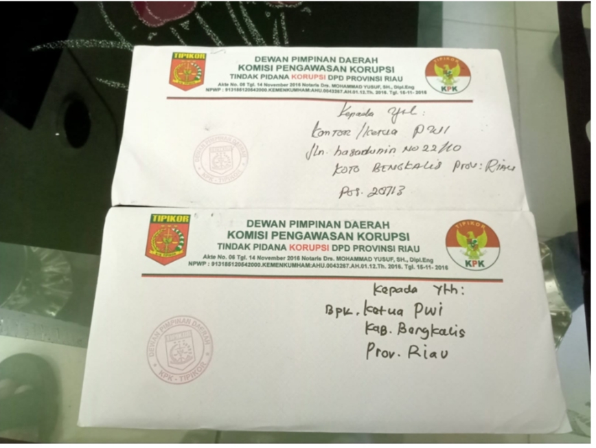 Pihak dimaksud menggunakan atribut yang menyerupai logo Komisi Pemberantasan Korupsi dan melakukan korespondensi kepada beberapa pihak di wilayah Provinsi Riau.