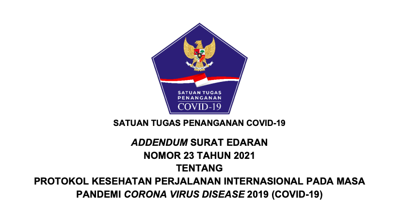 POJOKTIMES.COM | Jakarta – Satuan Tugas (Satgas) Penanganan COVID-19 mengeluarkan Addendum Surat Edaran (SE) Nomor 23 Tahun 2021 tentang Protokol Kesehatan Perjalanan Internasional pada Masa Pandemi Corona Virus Disease 2019 (COVID-19)