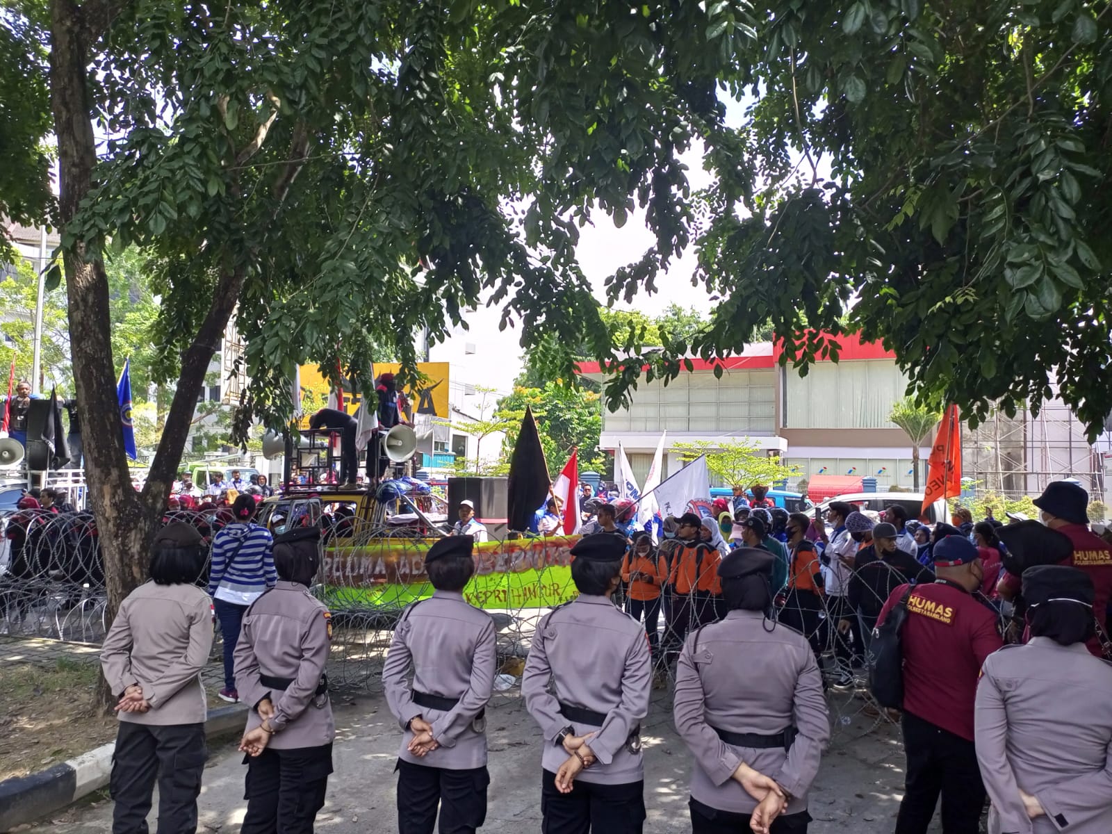 Aksi buruh hampir 5000 orang turun kelapangan meminta hak-hak tuntutan kepada Gubenur kepri saat ini masih bertahan, dan masih semangat menteriakkan suara orasinya.