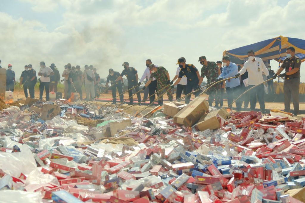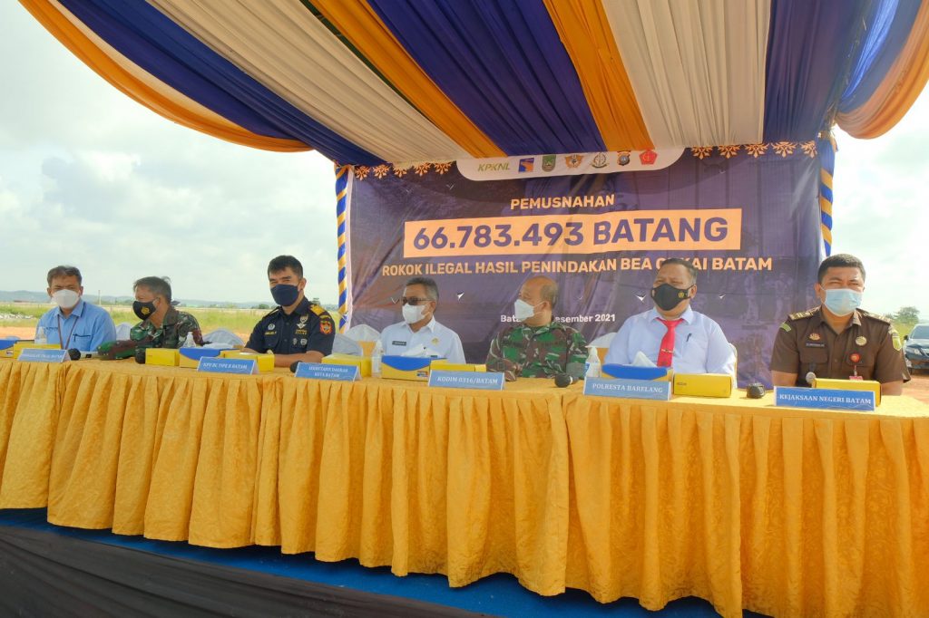 Pemusnahan kali ini dilakukan terhadap 66.783.493 batang rokok ilegal berbagai merek tanpa dilekati pita cukai atau dibubuhi tanda pelunasan cukai lainnya dari hasil penindakan operasi cukai dan penertiban izin pengusaha barang kena cukai yang ada di Batam.