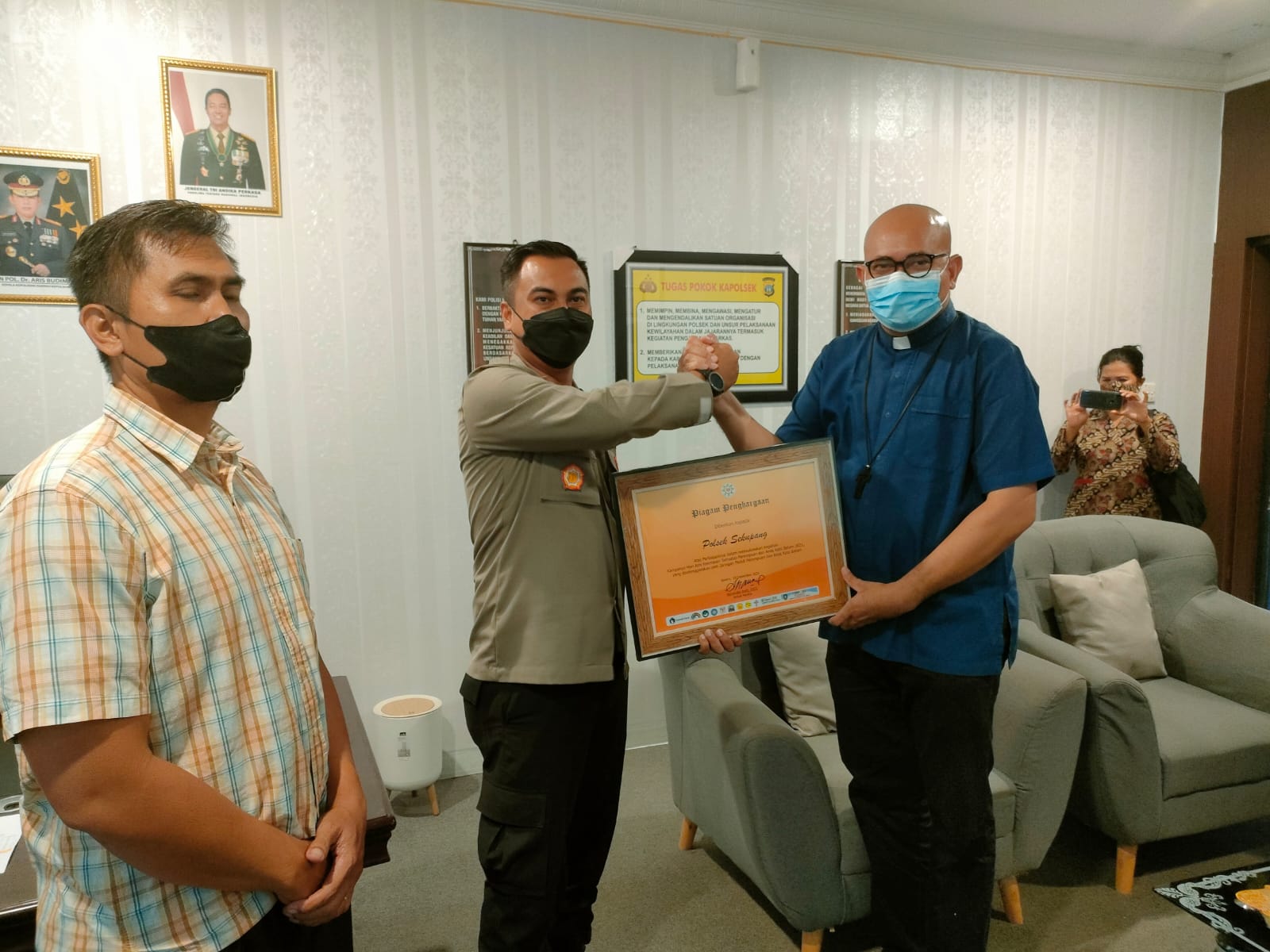 POJOKTIMES.COM | Batam – Kapolsek Sekupang Kompol Yudha Suryawardana, S.i.p., M.Si. terima Penghargaan Dari LSM Jaringan Peduli Migran, Peduli Perempuan Dan Anak Kota Batam yang di serahkan langsung oleh Romo Phaskal sebagai Pastor Ketua Komisi Keadilan Perdamaian Pastoral Migran dan Perantau (KKPPMP) Kepri bertempat di Mapolsek Sekupang, Kota Batam. Kamis (03/02/2022).