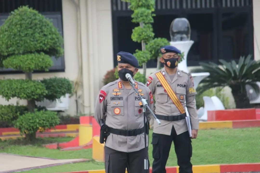 POJOKTIMES.COM | Medan – Komandan Satuan Brimob Polda Sumut Kombes Pol Christiyanto Goetomo, S.I.K.,S.H.,M.H. pimpin apel gabungan personil Brimob sekaligus ucapkan terima kasih kepada personil atas pelaksanaan tugas, Senin (7/2/22).