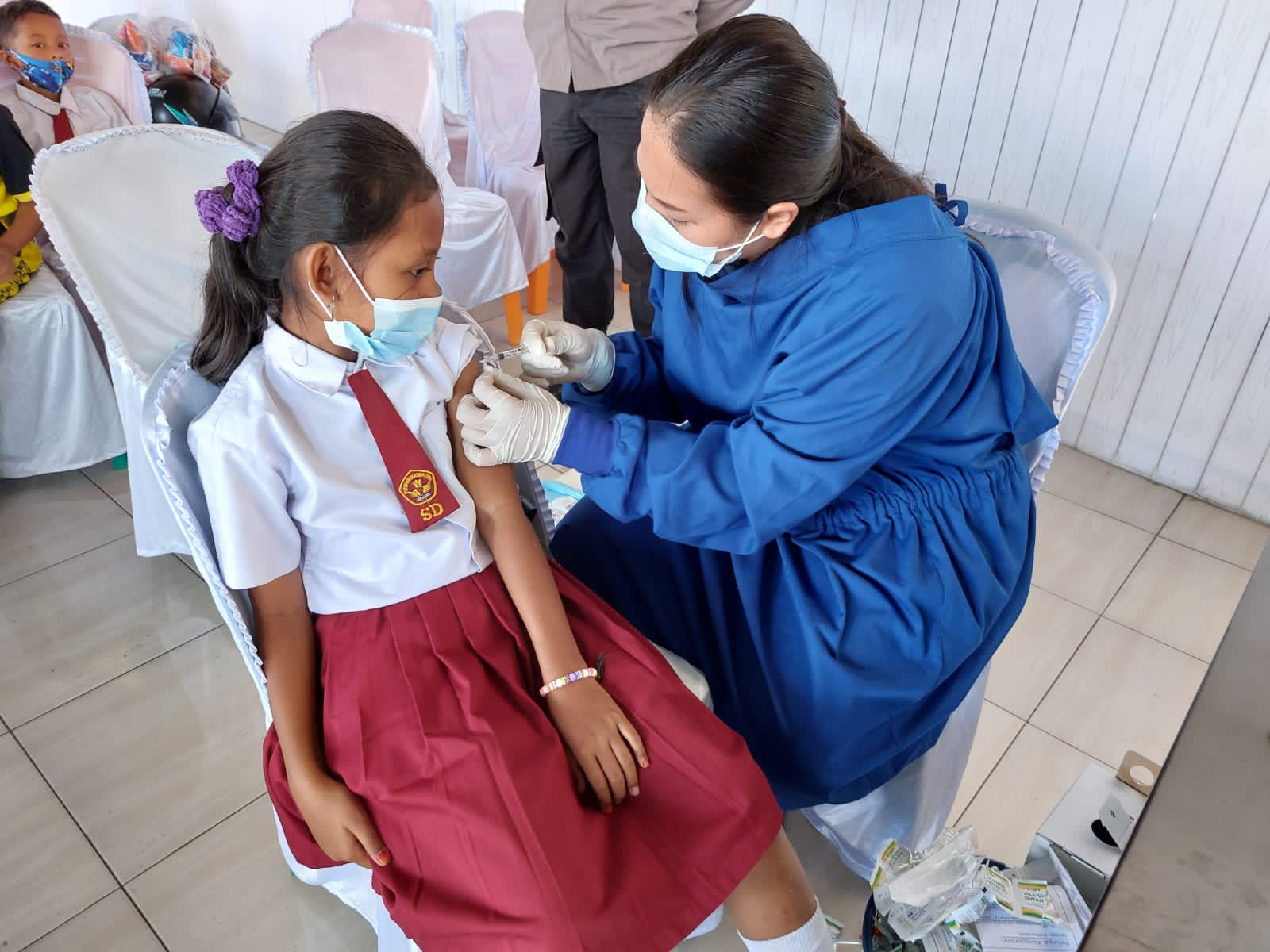 Dalam pelaksanaan vaksinasi, Anggota kesehatan Polresta Deli Serdang dibantu tenaga kesehatan dari Dinas Kesehatan Kabupaten Deli Serdang.