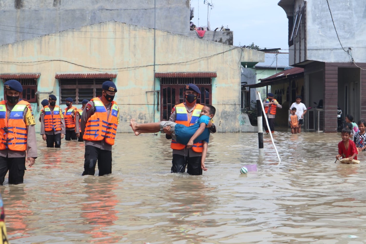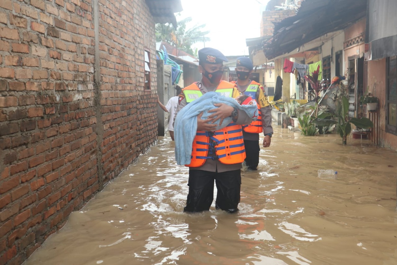 Ipda Mulyadi mengatakan pihaknya lakukan proses evakuasi terhadap seorang bayi perempuan ditengah banjir di kawasan Kecamatan Medan Maimun