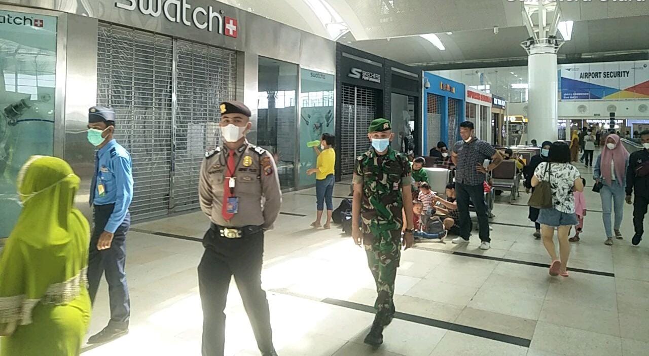 POJOKTIMES.COM | Deliserdang – Dalam rangka Antisipasi Penyebaran Covid-19 Varian Omicron, Personil Polsek Kawasan Bandara Kualanamu Laksanakan Patroli Yustisi di Areal Keberangkatan dan Kedatangan Bandara Internasional Kualanamu, Senin (14/3/2022) pagi.