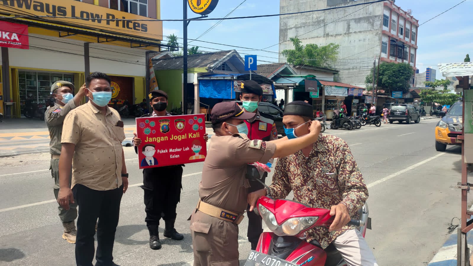 Selain menyampaikan himbauan, personil juga membagikan masker secara gratis kepada warga yang sekitar yang kedapatan tidak memakai masker saat melaksanakan aktivitas.