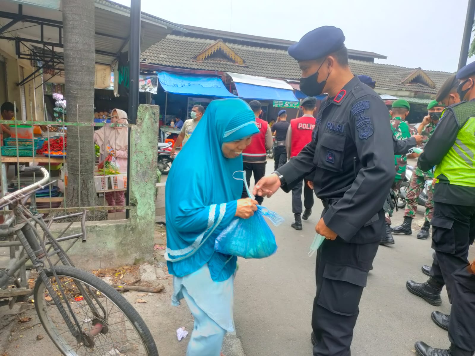 Dalam kegiatan tersebut personil gabungan terdiri dari Brimob, Dit Samapta, Dit Polairud, Dit Lantas Polda Sumut serta TNI bagikan sembako dan masker kepada masyarakat serta pedagang di Pasar Sambas dan Pasar Halat Kecamatan Medan Kota.