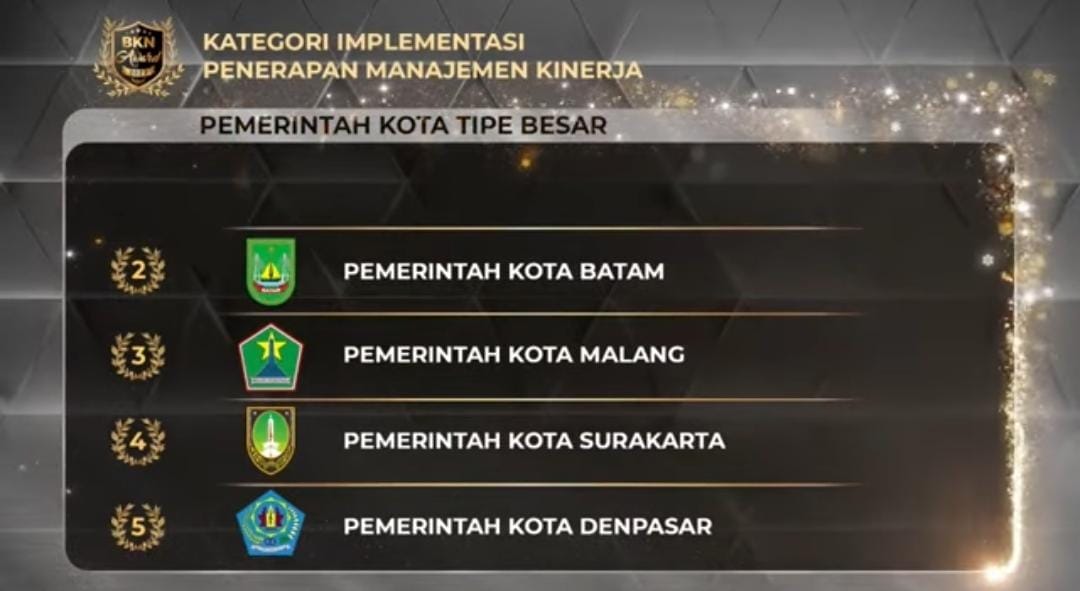Kemudian, penghargaan kedua, Kategori Implementasi Penerapan Manajemen Kinerja untuk Pemerintah Kota Tipe Besar. Batam mengungguli Pemko Malang, Pemko Surakarta, dan Pemko Denpasar. Tertinggi Pemko Mataram.