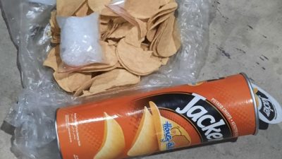 Kemudian petugas kami melakukan pengecekan ulang melalui x-ray dan melakukan pemeriksaan fisik terhadap barang tersebut. Kedapatan dua bungkus plastik berisi kristal putih yang disembunyikan di dalam kaleng makanan yang diduga merupakan narkotika. Setelah diuji nircotest dihasilkan warna biru yang artinya positif,” jelasnya.