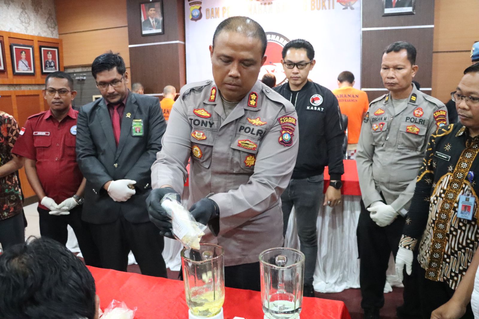 Kegiatan ini dipimpin Kapolres Karimun AKBP Tony Pantano, S.I.K., S.H. didampingi oleh Kasat Narkoba AKP Elwin Kristanto, S.I.K. dan Kasubsipenmas Sihumas IPTU Jordan Manurung dan dihadiri oleh Hakim Pengadilan Negeri Karimun, Kasi Barang Bukti Kejaksaan Negeri Karimun, Kasubbag Umum BNNK Karimun, Staf Rutan Karimun, penasehat hukum tersangka serta tokoh masyarakat Karimun.