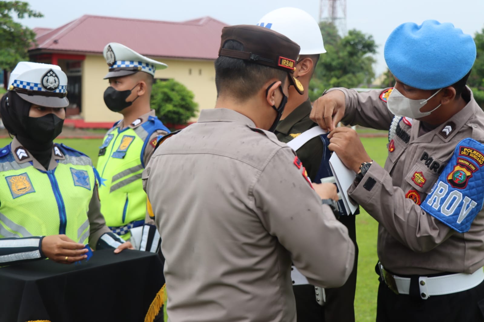 Sebelum menyampaikan sambutan, Kapolresta Deli Serdang Kombes Pol Irsan Sinuhaji, SIK, MH terlebih dahulu memeriksa barisan pasukan dan menyematkan pita tanda dimulainya Operasi Zebra Toba 2022.