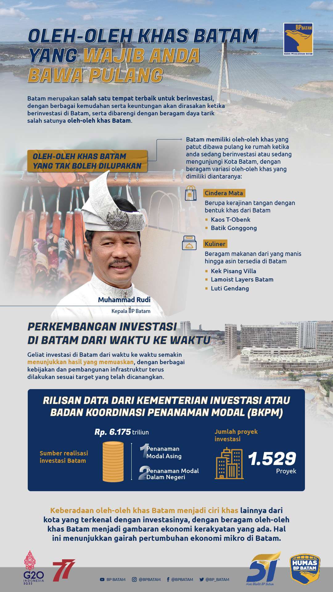 Salah satu tempat terbaik untuk melakukan investasi adalah di Batam. Mengapa demikian? Batam merupakan tempat yang selalu menawarkan dan memberikan pengalaman terbaik ketika Anda menanamkan modal. Berbagai kemudahan dan keuntungan akan Anda rasakan tatkala berinvestasi di Batam. Keberadaan Batam telah menjadi warna tersendiri bagi iklim investasi di Indonesia. Dengan segala daya tariknya tersebut, tak heran jika oleh-oleh khas Batam turut menjadi incaran.