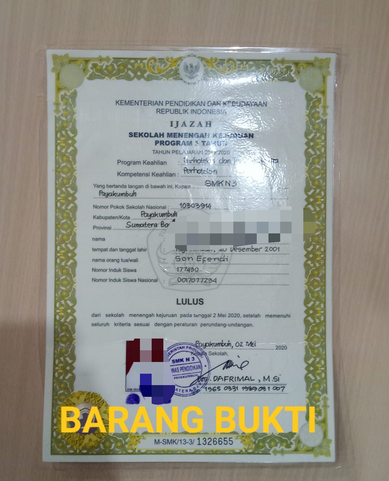 - 1 ( satu ) Lembar Ijazah Asli An. DPA yang di keluarkan oleh SMK NEGERI 3 Payakumbuh.