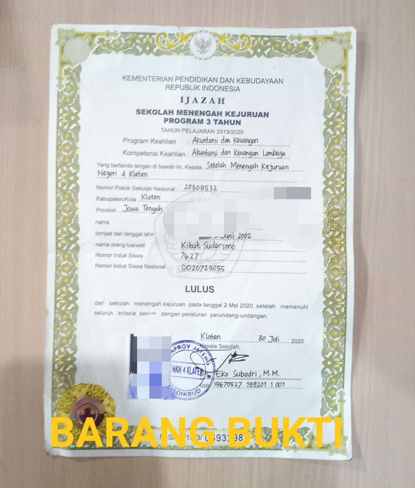 - 1 ( satu ) Lembar Ijazah Asli An. FKN yang di keluarkan oleh SMK NEGERI 4 Klaten.