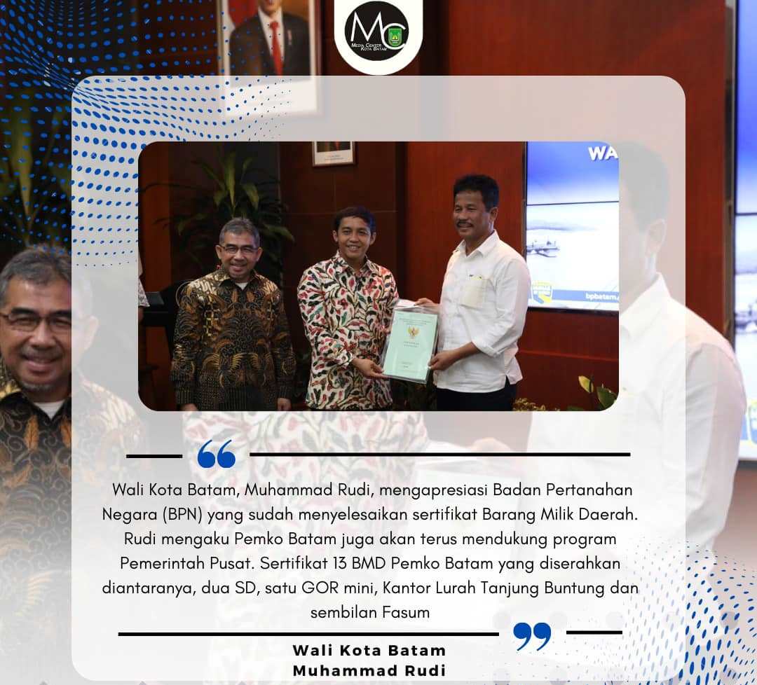 POJOKTIMES.COM | Batam – Wali Kota Batam, Muhammad Rudi, mengapresiasi Badan Pertanahan Negara (BPN) yang sudah menyelesaikan sertifikat Barang Milik Daerah (BMD).