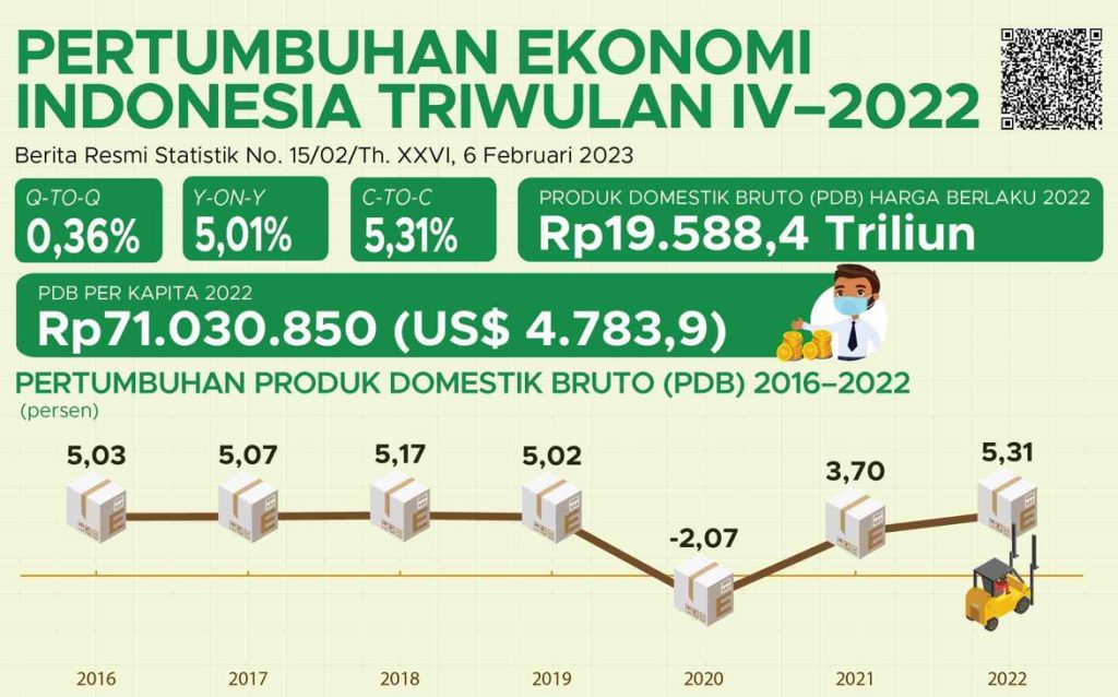 POJOKTIMES.COM | Jakarta – Badan Pusat Statistik (BPS) mencatat perekonomian Indonesia pada tahun 2022 berhasil tumbuh 5,31 persen dibanding tahun sebelumnya (year-on-year/yoy).  Perekonomian domestik tahun 2022 berhasil tumbuh berkat tingginya pertumbuhan pada triwulan IV-2022 yang naik 5,01 persen (yoy).