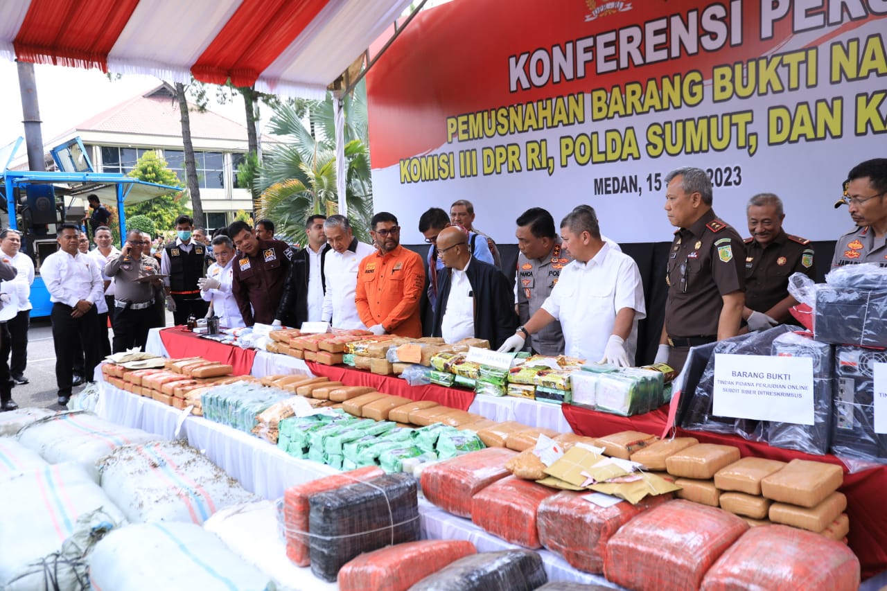 Pemusnahan barang bukti narkoba dipimpin Kapolda Sumut Irjen Pol RZ Panca Putra Simanjuntak, Kamis (15/6/2023) dihadiri Komisi III DPR RI dan Kajatisu Idianto SH.MH.
