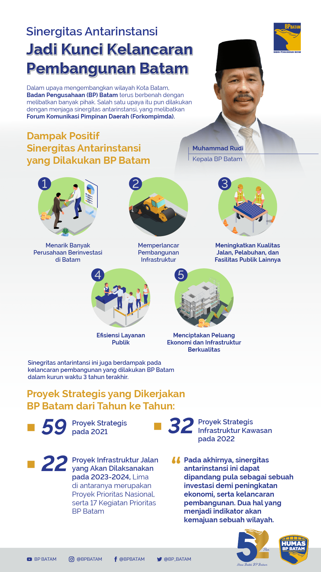 Sinegritas antarintansi ini juga berdampak pada kelancaran pembangunan yang dilakukan BP Batam dalam kurun waktu 3 tahun terakhir. Secara angka, setidaknya ada 59 proyek strategis infrastruktur yang telah selesai dibangun pada 2021 lalu. Kemudian, pada 2022 terdapat 32 proyek strategis infrastruktur kawasan yang berhasil diselesaikan BP Batam. Bahkan hingga 2024 mendatang, akan ada 22 proyek infrastruktur jalan yang akan dilaksanakan. Lima di antaranya merupakan proyek prioritas nasional, serta 17 kegiatan prioritas BP Batam. Pada akhirnya, sinergitas antarinstansi ini dapat dipandang pula sebagai sebuah investasi demi peningkatan ekonomi, serta kelancaran pembangunan. Dua hal yang menjadi indikator akan kemajuan sebuah wilayah.(*)