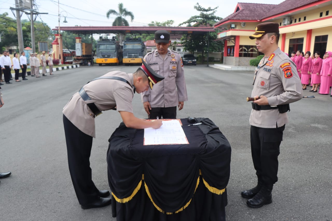 Selanjutnya para pejabat yang serah terima diambil sumpah jabatan di hadapan peserta yang ada dan melakukan penandatangan fakta integritas di hadapan Kapolresta Deli Serdang Kombes Pol Irsan Sinuhaji, SIK, MH.