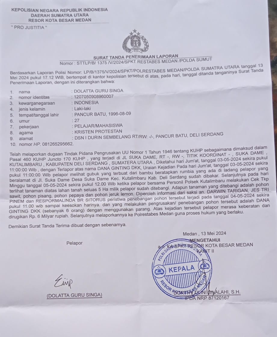 Selain itu, Ponten Manik juga mengaku kenal dengan Dana Ginting dkk yang telah merusak tanaman di lahan milik ahli waris Mistar Gurusinga. Ia pun tahu bahwa kasus pengrusakan telah dilaporkan ke Polrestabes Medan.