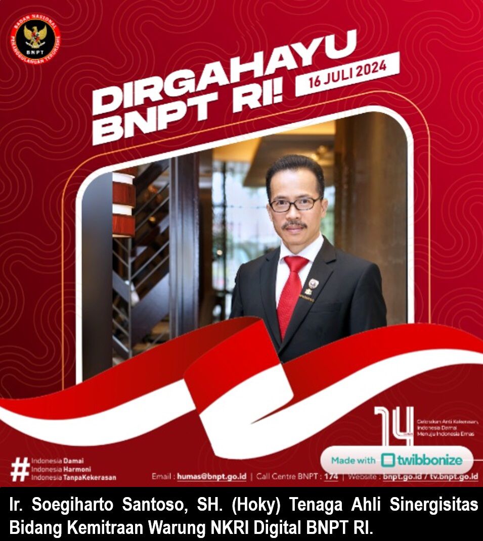 POJOKTIMES.COM | Jakarta – Ketua Umum Asosiasi Pengusaha TIK Nasional (APTIKNAS) sekaligus Sekretaris Jenderal Perkumpulan Advokat Teknologi Informasi Indonesia (PERATIN) Ir. Soegiharto Santoso, SH. selaku Tenaga Ahli Sinergisitas Kemitraan Warung NKRI Digital Badan Nasional Penanggulangan Terorisme Republik Indonesia (BNPT RI), menyampaikan rasa Syukur dan ucapan Selamat Ulang Tahun kepada Badan Nasional Penanggulangan Terorisme Republik Indonesia (BNPT RI) yang ke-14.