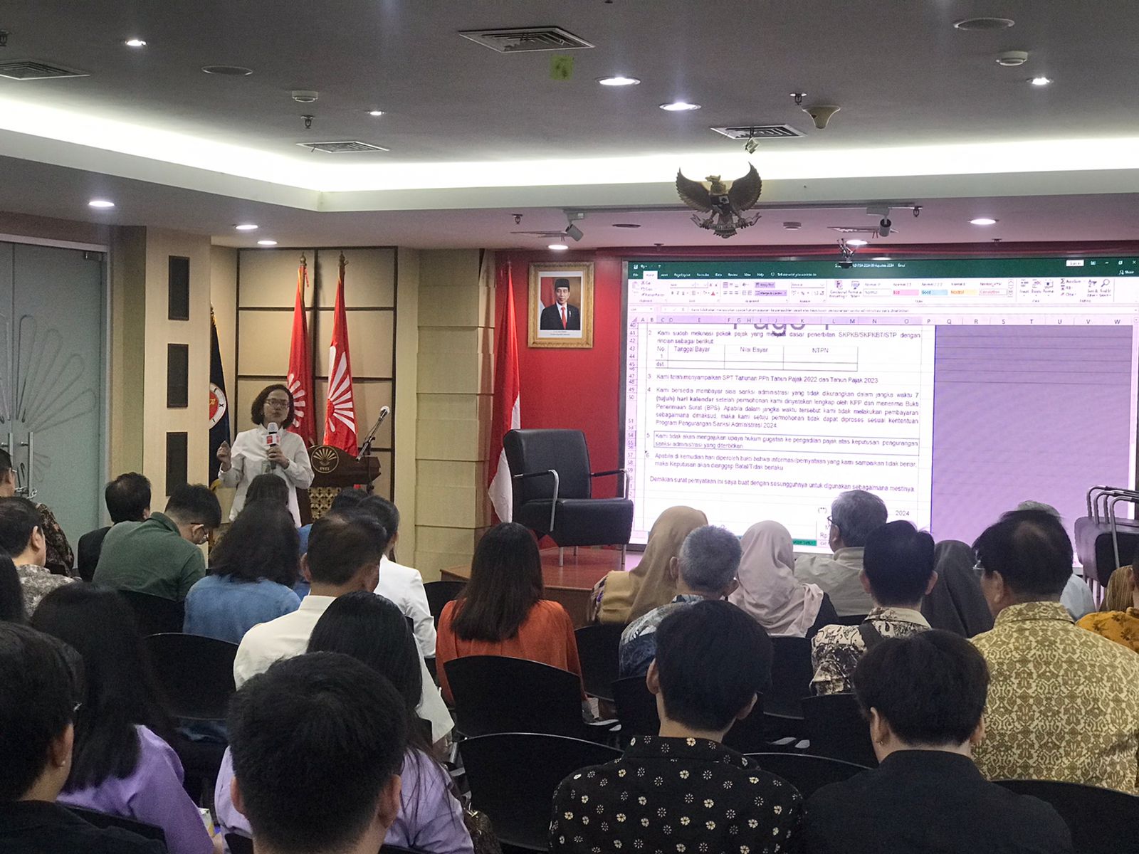 Pembicara tunggal Tetty Lisme selaku Kepala Seksi Keberatan, Banding, dan Pengurangan III Kanwil DJP Jakarta Barat memaparkan mekanisme dan persyaratan pengajuan pengurangan sanksi administrasi pajak bagi pengusaha.