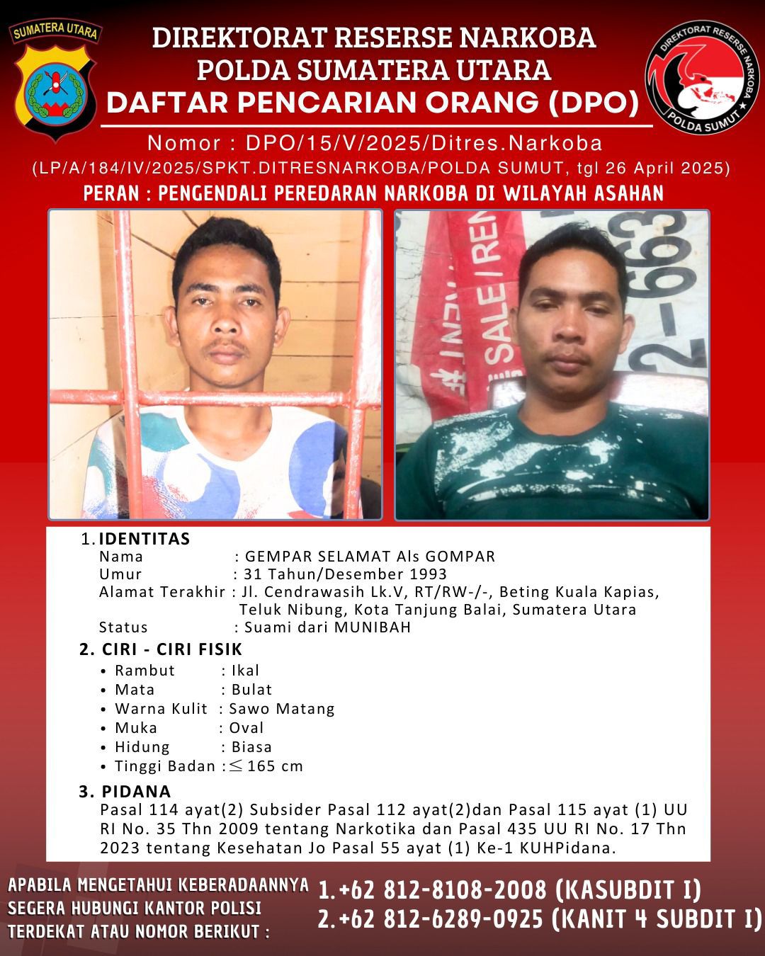 Polda Sumut Tetapkan Gempar Selamat Alias Gompar sebagai Tersangka Narkotika, Kini Buron dan Masuk DPO