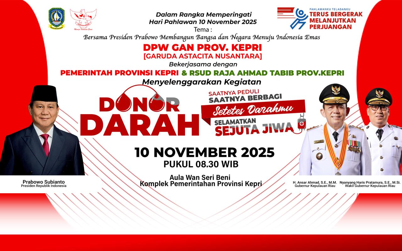 Aksi donor darah ini akan dilaksanakan di Kompleks Pemerintahan Provinsi Kepri, Dompak, Tanjung Pinang, mulai pukul 08.30 WIB. Seluruh Aparatur Sipil Negara (ASN) di lingkungan Pemerintah Provinsi Kepulauan Riau diharapkan turut berpartisipasi dalam kegiatan ini.