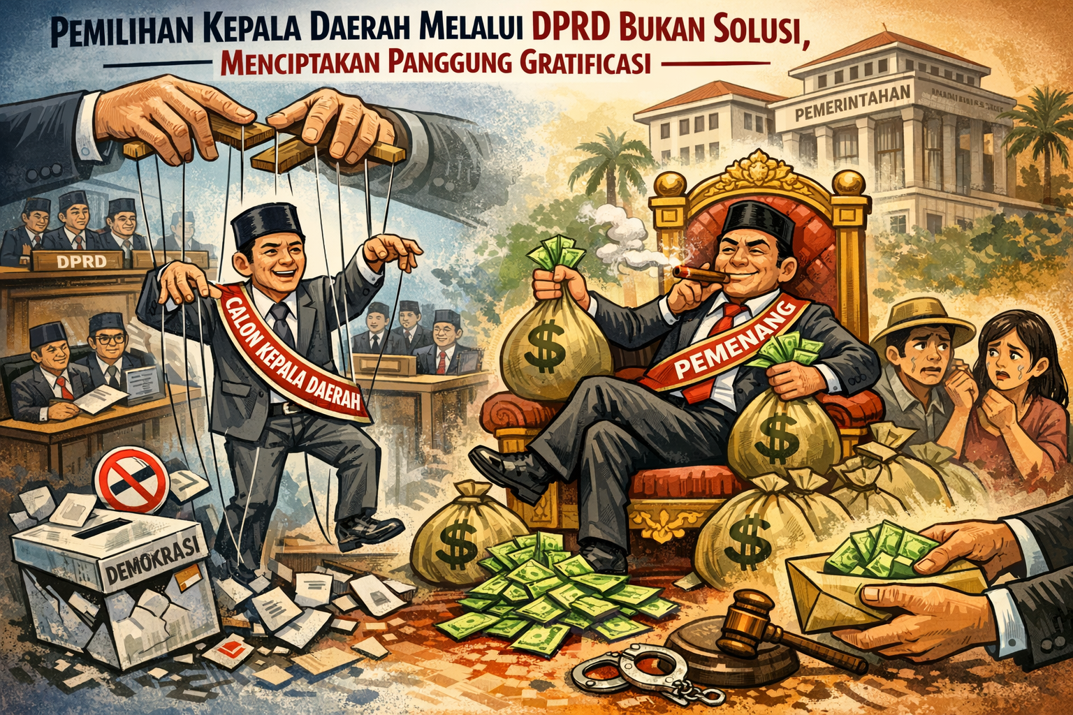 Oleh karena itu, wacana Pilkada melalui DPRD patut disayangkan. Selain memperlihatkan kegagalan partai politik dalam menciptakan demokrasi yang berkeadilan sosial, sistem ini juga membuka peluang besar terjadinya gratifikasi dan transaksi politik. Risiko hukum bagi anggota DPRD maupun partai pengusung akan semakin tinggi, yang pada akhirnya justru merugikan partai politik itu sendiri.