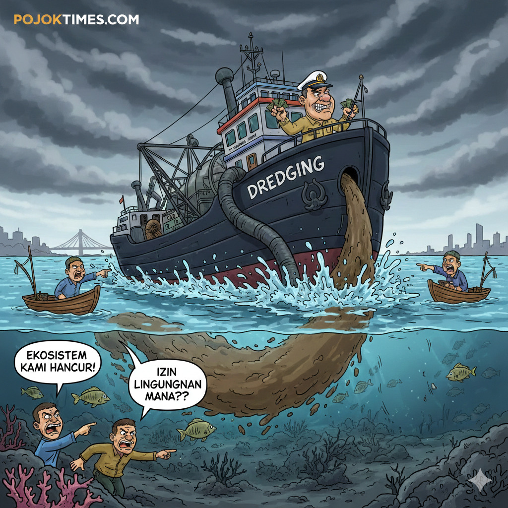 Lebih jauh, lokasi pengerukan yang berada di sekitar kawasan strategis negara menimbulkan pertanyaan besar terkait fungsi pengawasan lintas kementerian dan lembaga.