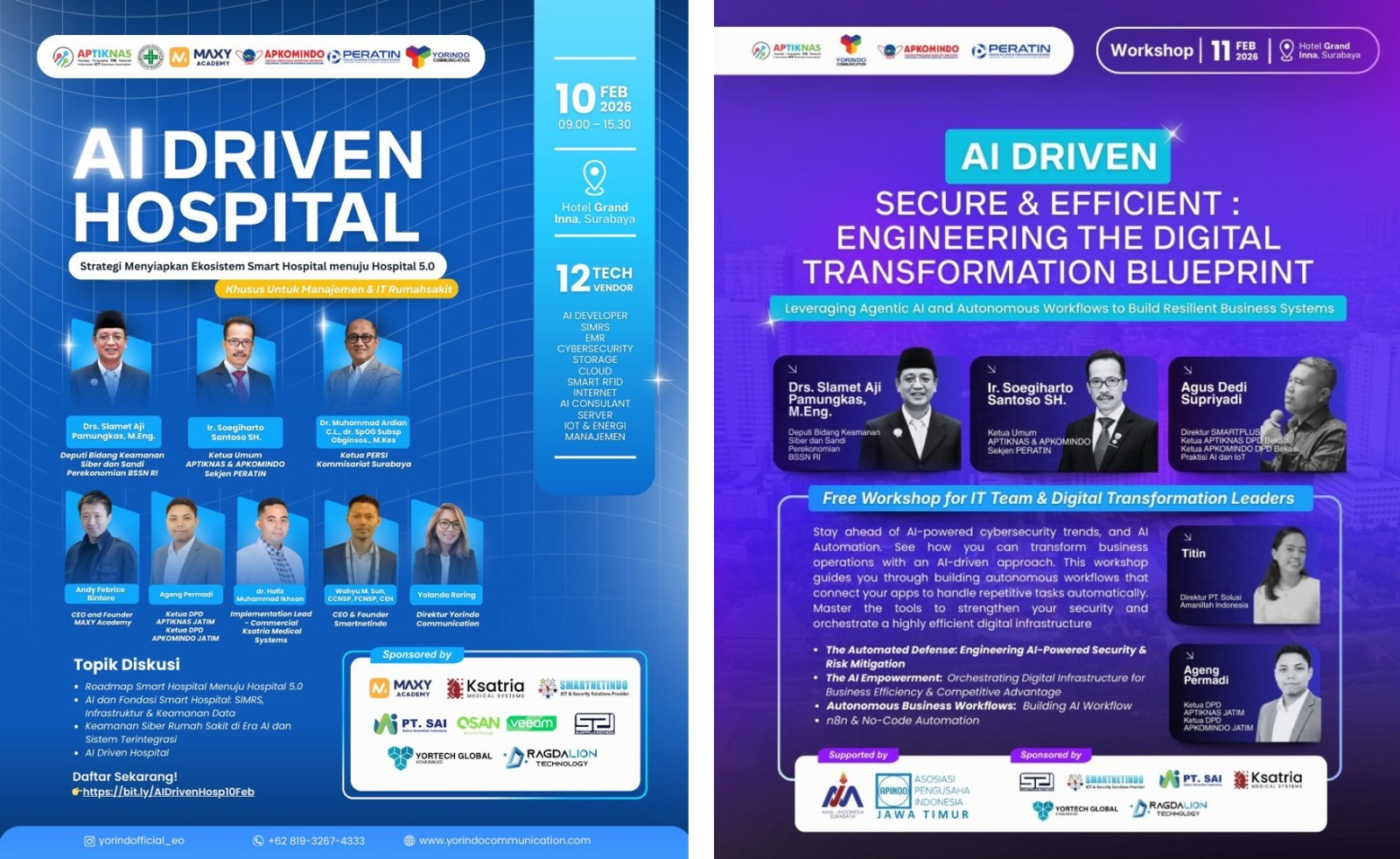 POJOKTIMES.COM | Surabaya – Dalam sebuah kolaborasi strategis yang melibatkan sektor swasta dan pemerintah, Yorindo Communication bersama APKOMINDO dan APTIKNAS sukses menggelar rangkaian kegiatan edukasi teknologi selama dua hari pada 10 hingga 11 Februari 2026. Bertempat di Hotel Grand Inna, Surabaya, acara ini mengusung dua tema berbeda yang dirancang secara spesifik untuk menjawab tantangan transformasi digital di sektor kesehatan dan industri umum. Sorotan utama kegiatan ini adalah partisipasi penuh Badan Siber dan Sandi Negara (BSSN) selama dua hari, yang mendapat apresiasi tinggi sebagai wujud sinergi nyata antara regulator, asosiasi industri, dan pelaku usaha.