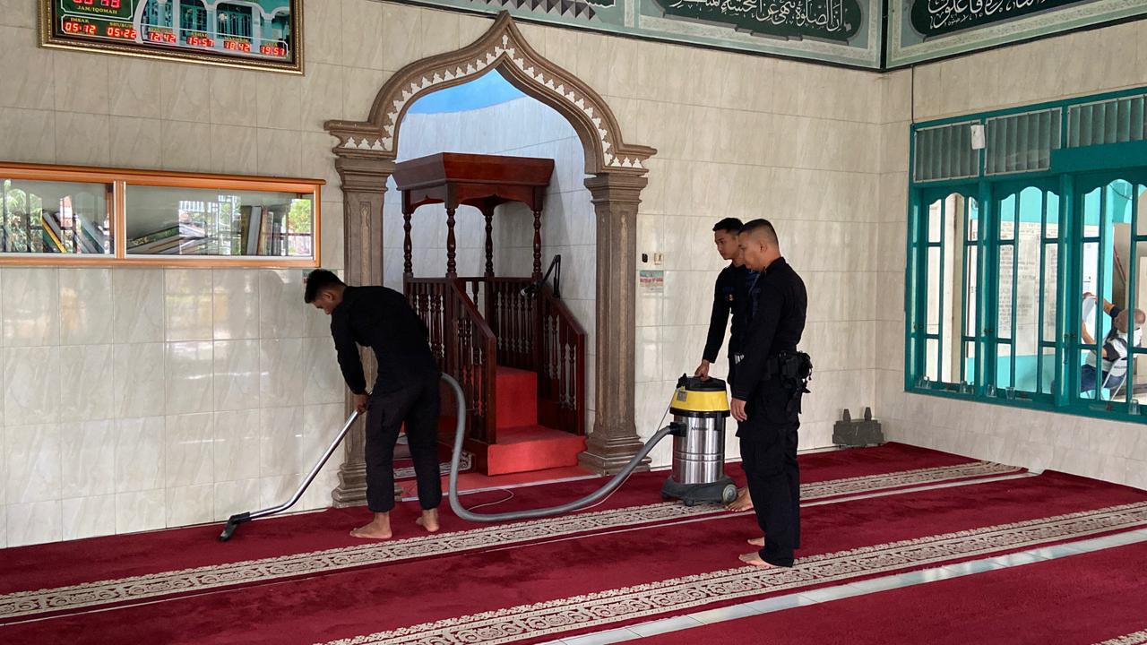 Dalam pelaksanaannya, personel Brimob membersihkan area dalam masjid, halaman, serta fasilitas pendukung lainnya.