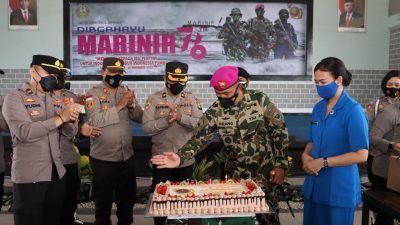 Polresta Barelang Beri Kejutan Kue Ulang Tahun Datangi Mako Yonif Marinir 10 Batam